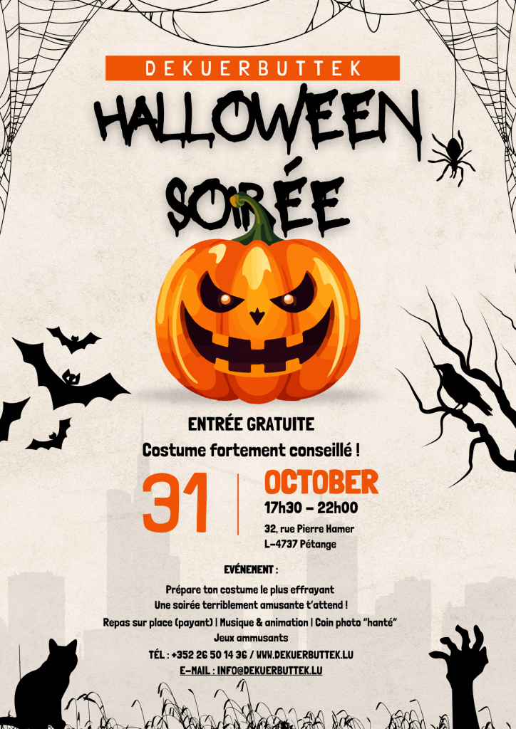 🎃 Halloween Soirée au DeKuerbuttek 🎃 Préparez-vous pour une nuit terrifiante et inoubliable !Le 31 octobre, DeKuerbuttek ouvre ses portes pour une Halloween Soirée pleine de frissons, de rires et de surprises. 🕸️ Infos pratiques :📍 32, rue Pierre Hamer, L-4737 Pétange⏰ De 17h30 à 22h00🎟️ Entrée gratuite (costume fortement conseillé !) 👻 Au programme […]